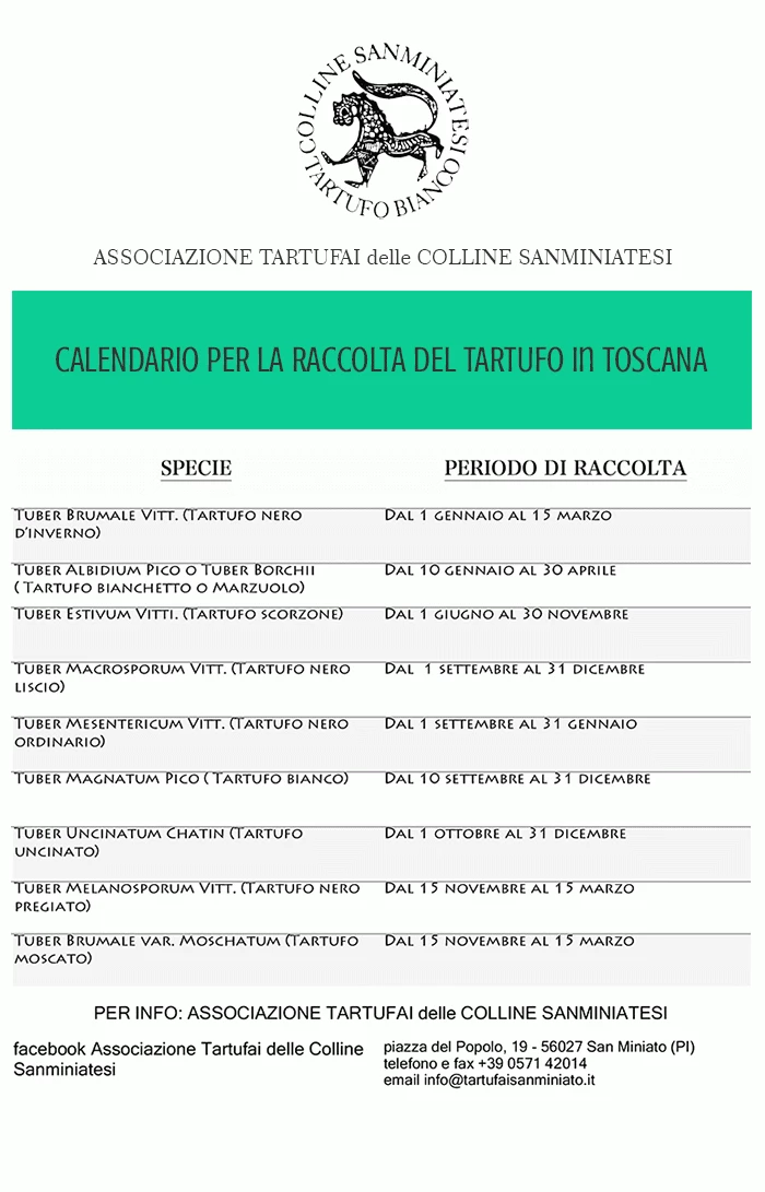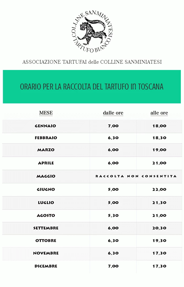 I cercatori - tartufai - sono uniti dal 1982 nell' Associazione Tartufai Delle Colline Sanminiatesi costituita con l'obbiettivo di "favorire la tutela, la raccolta, la produzione e la valorizzazione del Tartufo Bianco di San Miniato". Ecco i loro orari di raccolta: