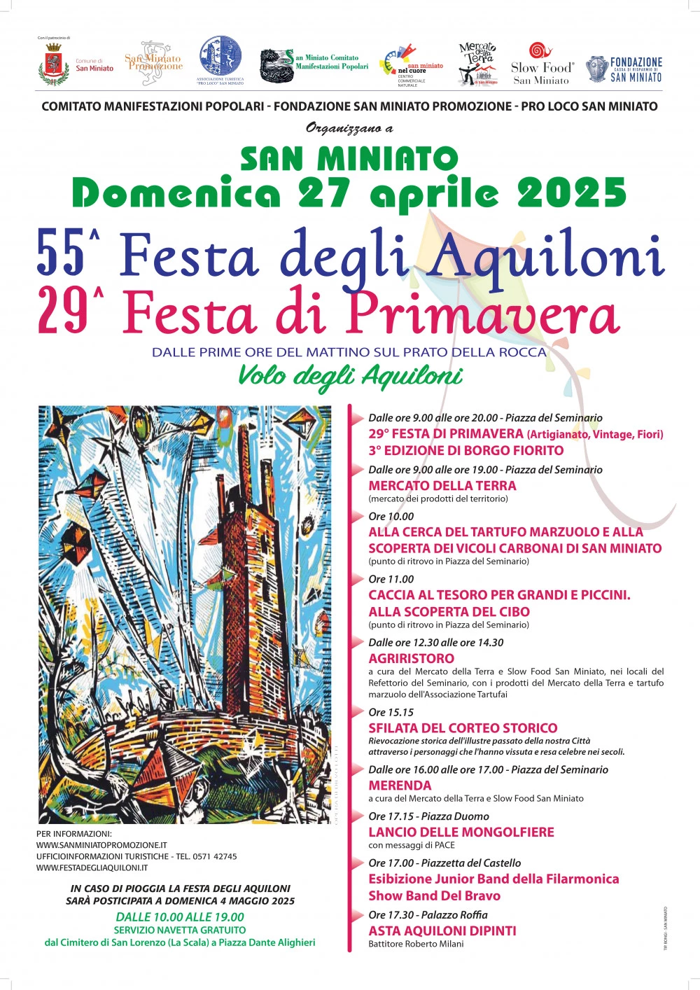Non perdete l'occasione di partecipare ad uno degli eventi simbolo della città di San Miniato. Sin dalle prime ore del mattino, sul prato della rocca sarà possibile far volare il proprio aquilone. Oltre a ciò numerose saranno anche le altre attività che vi attenderanno lungo tutto il centro storico della città di San Miniato.