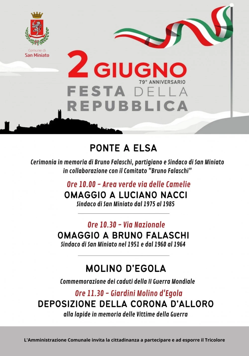 2 giugno, le celebrazioni del Comune di San Miniato per festeggiare la Repubblica