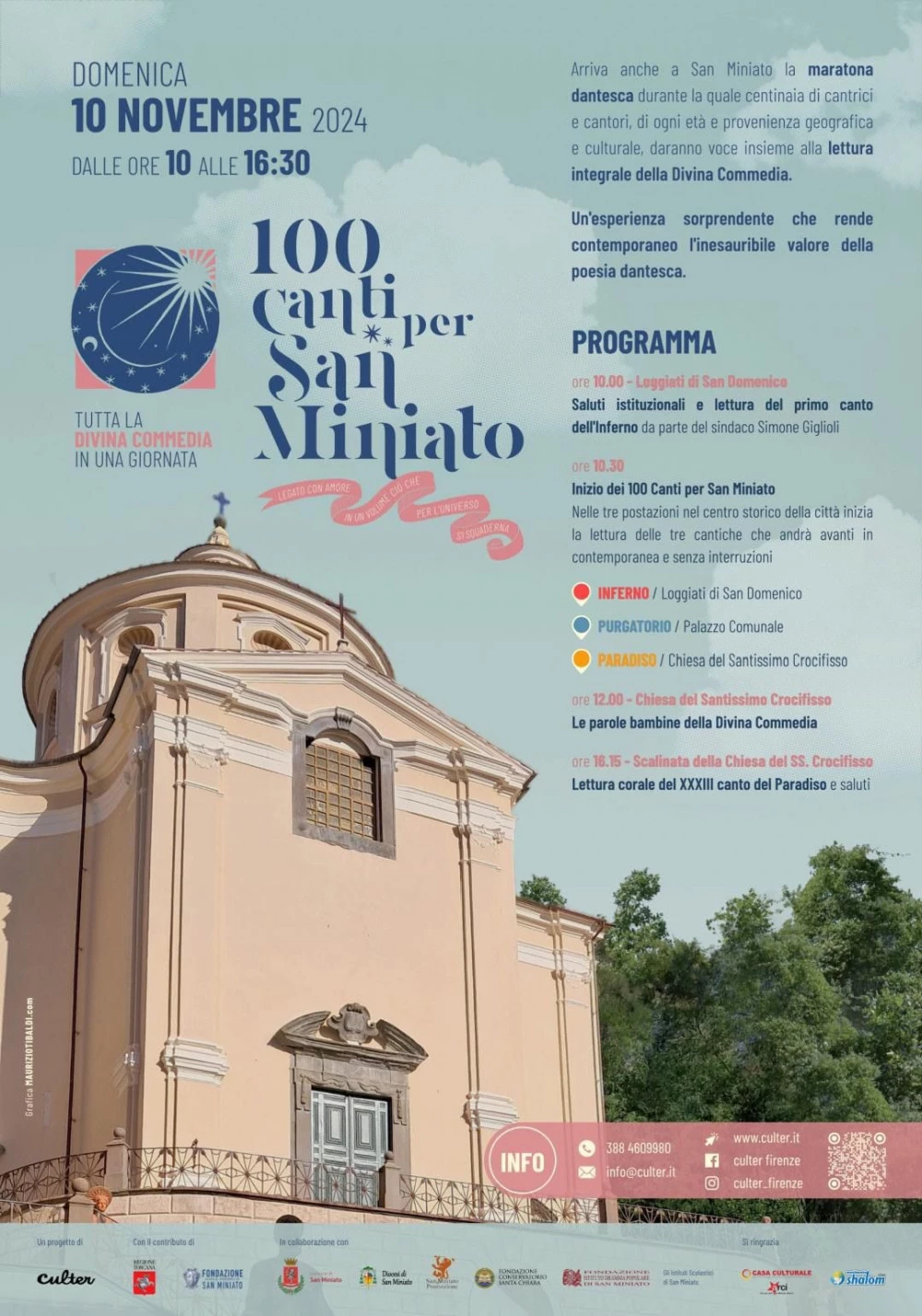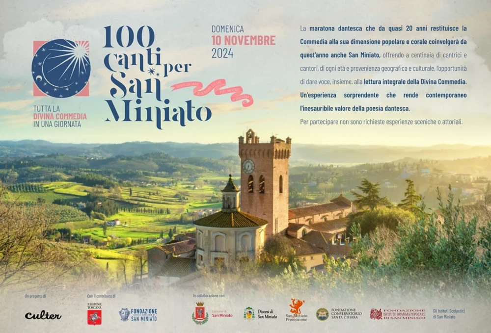 "100 Canti - Legato con amore in un volume ciò che per l'universo si squaderna è uno dei primi tentativi di restituire la poesia dantesca alla sua dimensione popolare e corale coinvolgendo centinaia di persone in un percorso di formazione e restituzione pubblica; nato quasi 20 anni fa, da quest'anno coinvolgerà anche San Miniato, offrendo a centinaia di cantrici e cantori, di ogni età e provenienza geografica e culturale, l'opportunità di dare voce, insieme, alla lettura integrale della Divina Commedia. Un'esperienza sorprendente che rende contemporaneo l'inesauribile valore della poesia dantesca."