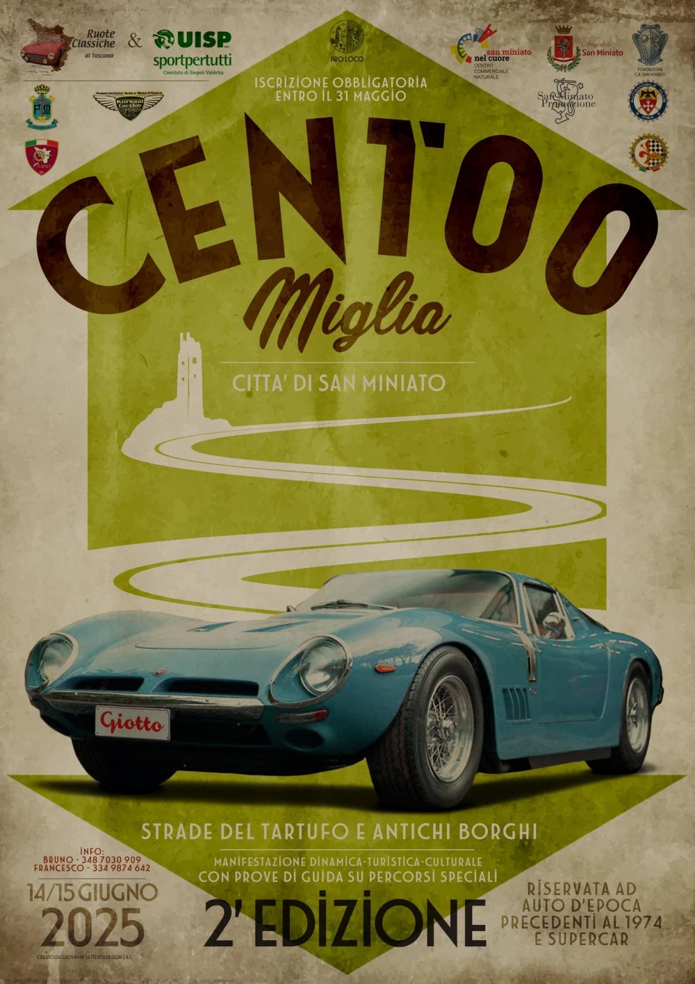 Il 14 e 15 giugno 2025 prende il via la seconda edizione della manifestazione turistica-culturale, 100 Miglia – Città di San Miniato, organizzata dal Comune di San Miniato, dalla Fondazione San Miniato Promozione e dall’associazione Ruote Classiche, con il sostegno della Fondazione CRSM, riservata ad auto immatricolate entro il 1974 (compreso), con prove di guida su percorsi speciali!