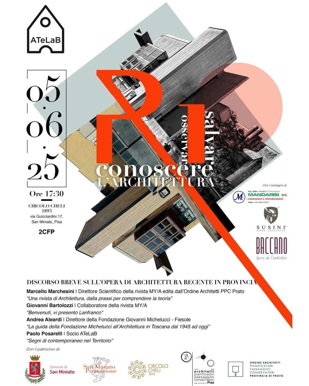 Questi aspetti saranno affrontati con gli interventi degli architetti: Marcello Marchesini – Direttore Scientifico rivista MY/A edita dall’ Ordine Architetti PPC di Prato; Giovanni Bartolozzi – Collaboratore della rivista MY/A; Andrea Aleardi Direttore della Fondazione Giovanni Michelucci di Fiesole; Paolo Posarelli socio ATeLaB. L’evento è organizzato con il Patrocinio del Comune di San Miniato, San Miniato Promozione, Circolo Cheli 1893, Ordine degli Architetti Pianificatori Paesaggisti Conservatori della provincia di Pisa e Ordine degli Architetti Pianificatori Paesaggisti Conservatori di Prato e con il sostegno di: Impresa Edile Mandarisi, Ditta Susini_Home Exclusive e Baccano_Gusto da condividere.