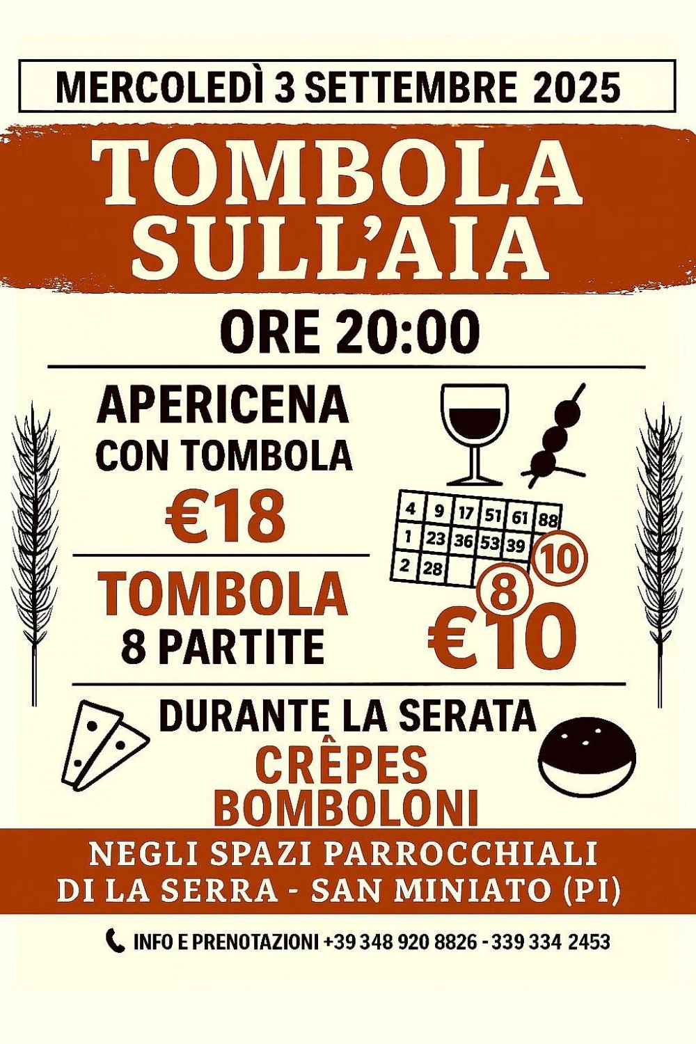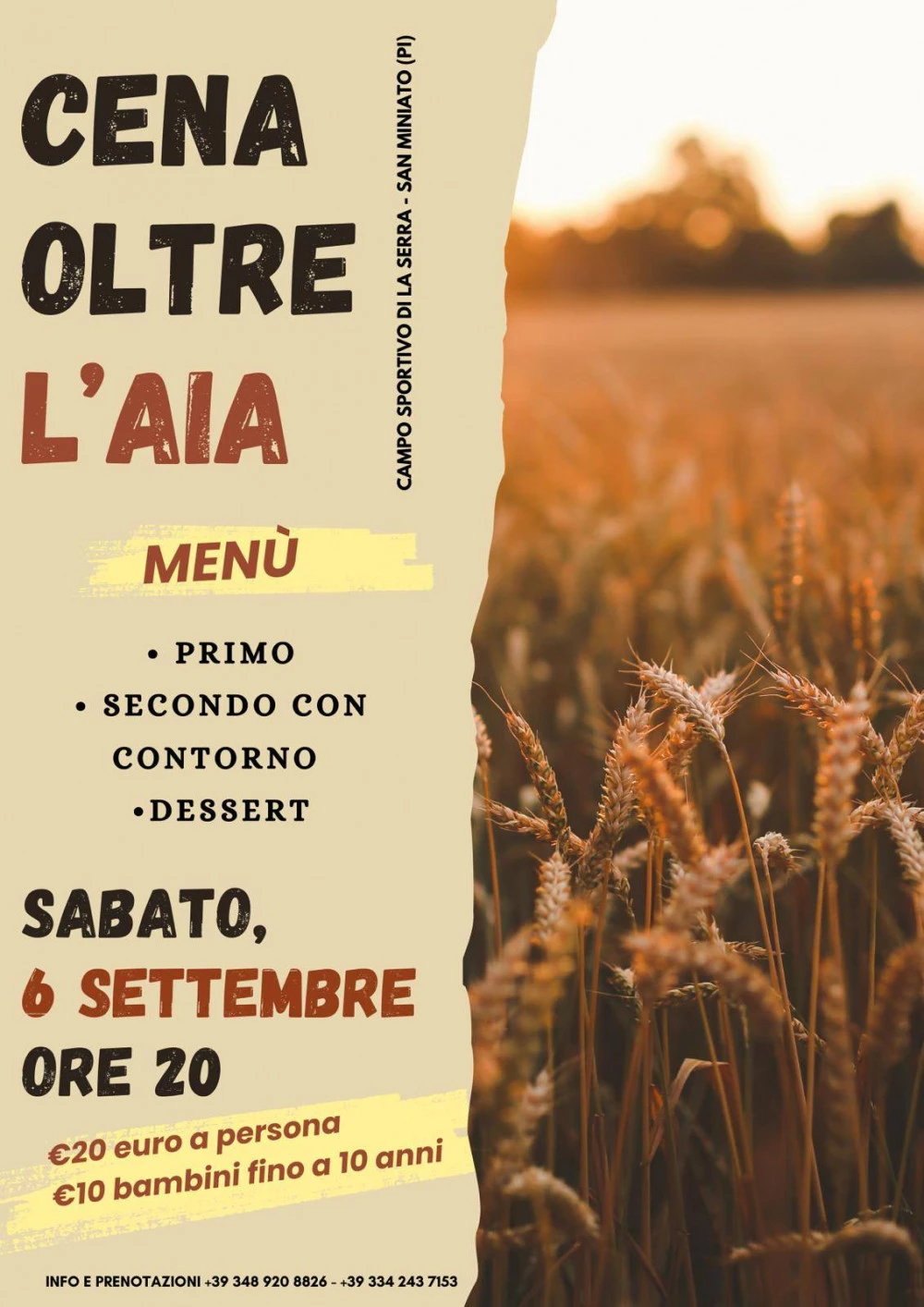 Dal 3 al 6 settembre, nella frazione de La Serra di San Miniato, torna la Festa sull'Aia, un appuntamento che riporta indietro nel tempo facendo rivivere le autentiche tradizioni contadine. Protagonista sarà la battitura del grano, eseguita con macchine d'epoca e con la partecipazione di contadini che ricreeranno l'atmosfera di oltre cinquant'anni fa, quando questo rito rappresentava il momento più importante dell'anno agricolo, vissuto come una vera festa da tutta la comunità.