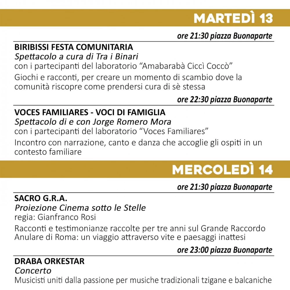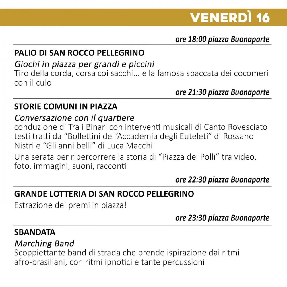 Un festival popolare con spettacoli, film e dibattiti per riscoprire i luoghi nascosti del centro storico, un po' come facevano un tempo i pellegrini che percorrevano la via Francigena, di cui San Rocco è il protettore. Lo scorso anno l'iniziativa è riuscita a raggiungere un pubblico totale di circa 2000 persone. Chiude la kermesse il Palio di San Rocco con giochi in piazza per grandi e piccini.
