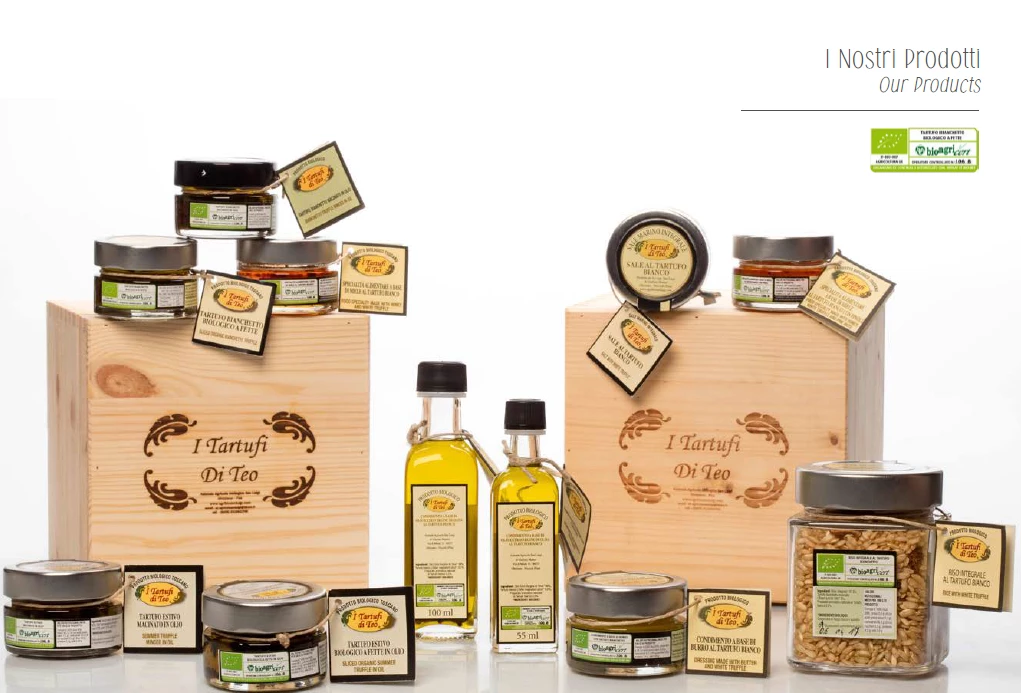 Prima azienda in Italia ad aver ottenuto la certificazione biologica del tartufo nel 2014. Nel 2015 nasce la nostra linea di prodotti al tartufo biologici che produciamo nel piccolo laboratorio artigianale direttamente in azienda. Nei nostri prodotti il tartufo è abbinato a materie prime di eccellenza del nostro territorio , non sono presenti all’interno dei prodotti aromi di sintesi e la produzione dei vari prodotti segue la stagionalità del tartufo. In azienda è presente un punto vendita dove è possibile acquistare tartufo fresco e i tutti nostri prodotti.
