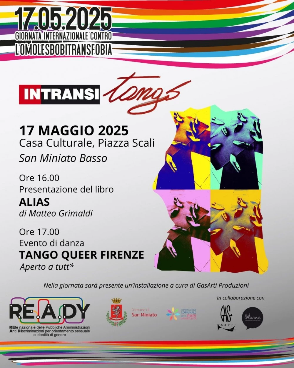 Il 17 maggio si celebra la Giornata contro l'Omolesbobitransfobia. In occasione di questa importante giornata, il Comune di San Miniato, la Commissione Pari Opportunità e l'associazione GasArti organizzano 𝙄𝙣𝙩𝙧𝙖𝙣𝙨𝙞𝙩𝙖𝙣𝙜𝙤, un pomeriggio di eventi alla Casa Culturale per promuovere l'inclusione, il rispetto e la solidarietà verso tutte le persone, indipendentemente dal loro orientamento sessuale o identità di genere, un evento sostenuto dalla Rete Ready.Alle 16.00 presentazione del libro di Matteo Grimaldi, "Alias" e alle 17.00 evento di danza con il Tango Queer di Firenze.