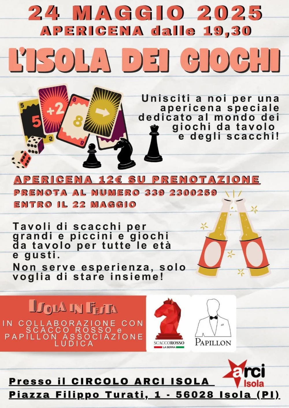 Venite a trovarci Sabato 24 Maggio al Circolo Arci di Isola! Vi aspettiamo con tantissimi giochi da tavolo e mitici combattimenti sulle scacchiere dalle 21:00! 🤠🎲♟️