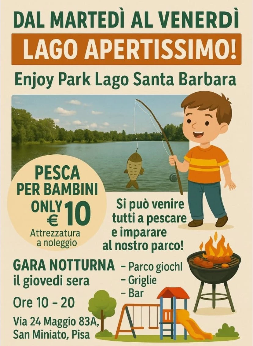 Dal Martedì al Venerdì, per tutto il mese di Agosto, chiunque fosse interessato, si terrà 𝗟𝗮𝗴𝗼 𝗔𝗽𝗲𝗿𝘁𝗶𝘀𝘀𝗶𝗺𝗼! presso il Lago Santa Barbara, sarà possibile pescare ed imparare al fianco di veri professionisti