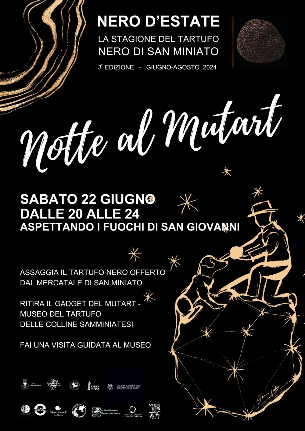 Dalle 20,00 a mezzanotte ci troverete davanti al nostro nuovo Museo per offrirvi assaggi al Tartufo Nero insieme al Mercatale di San Miniato. Dopo aver soddisfatto il palato, potrete ritirare il gadget targato MuTart e accedere a una visita guidata.