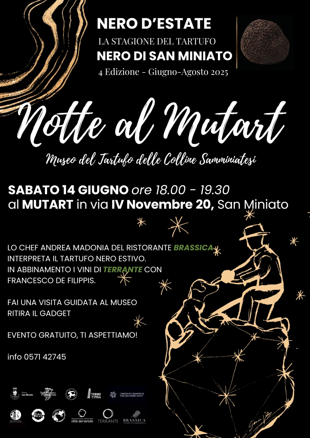 Sabato 14 giugno 2025, dalle ore 18.00 alle 19.30, torna l’atteso appuntamento con “Notte al Mutart”, l’evento promosso dalla Fondazione San Miniato Promozione per celebrare l’inizio della stagione del tartufo nero estivo.