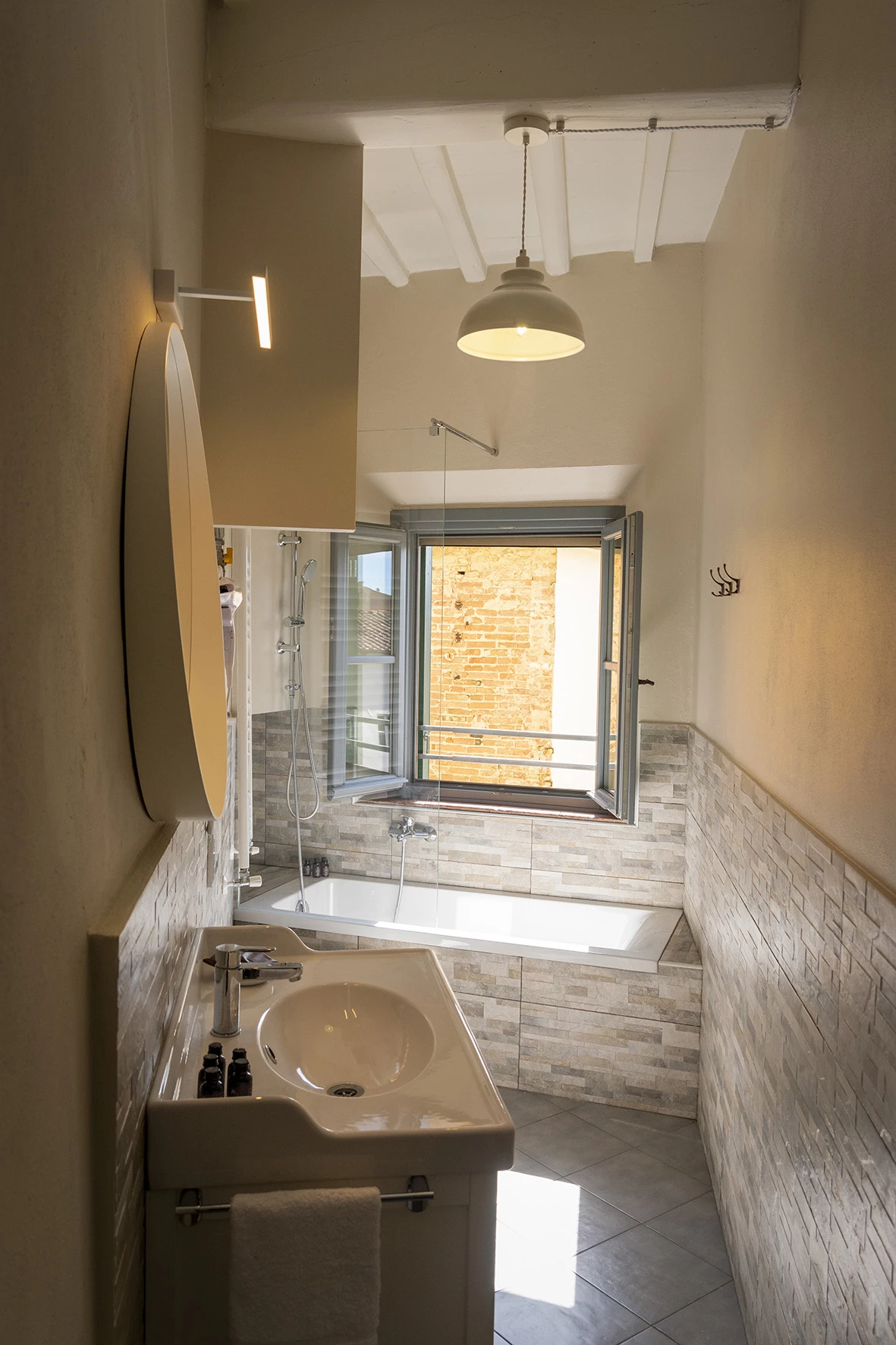 Nel bagno con vasca munita di soffione doccia a parete, gli ospiti troveranno un set di cortesia per l’igiene, asciugacapelli e morbidi asciugamani.