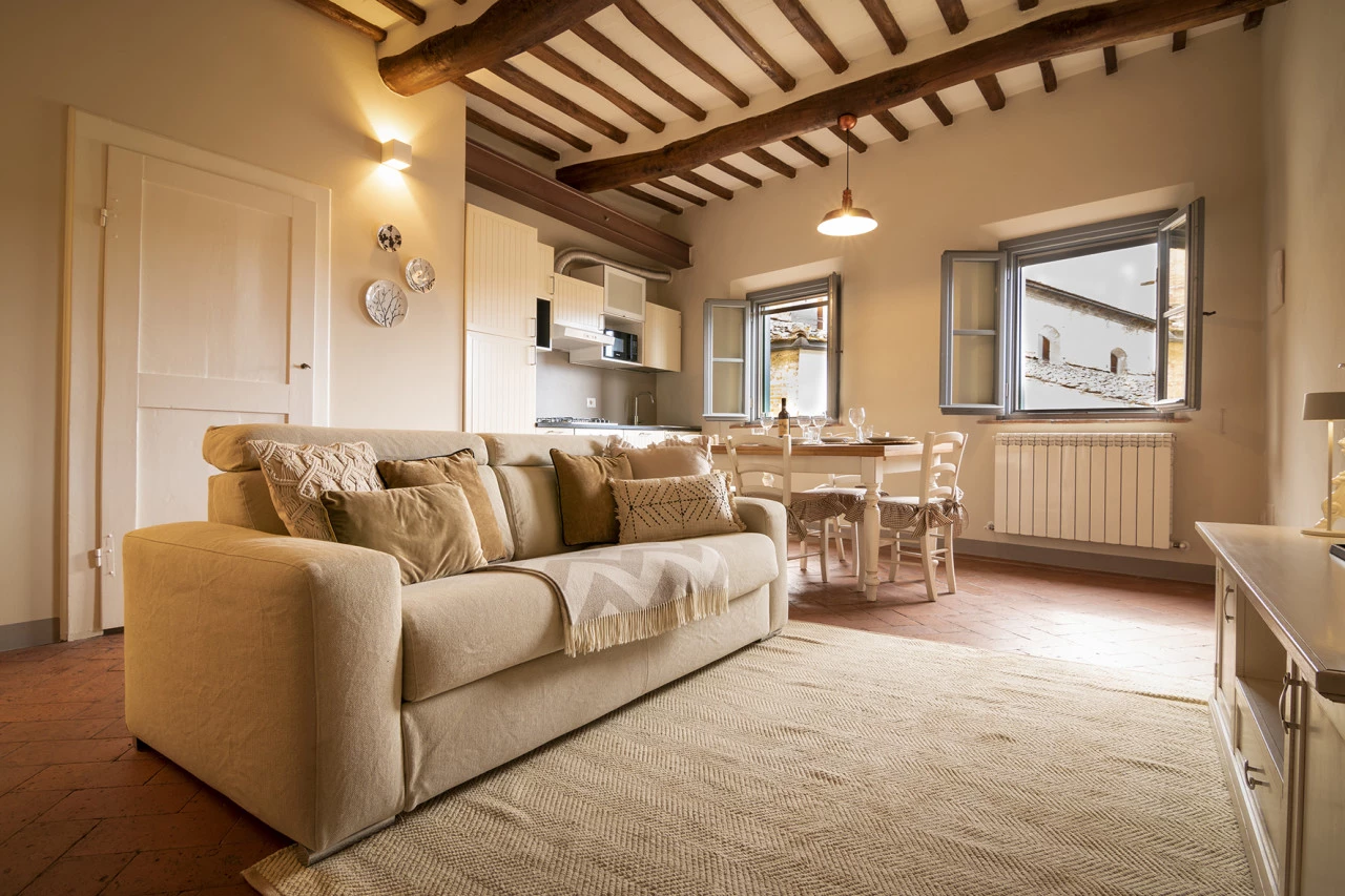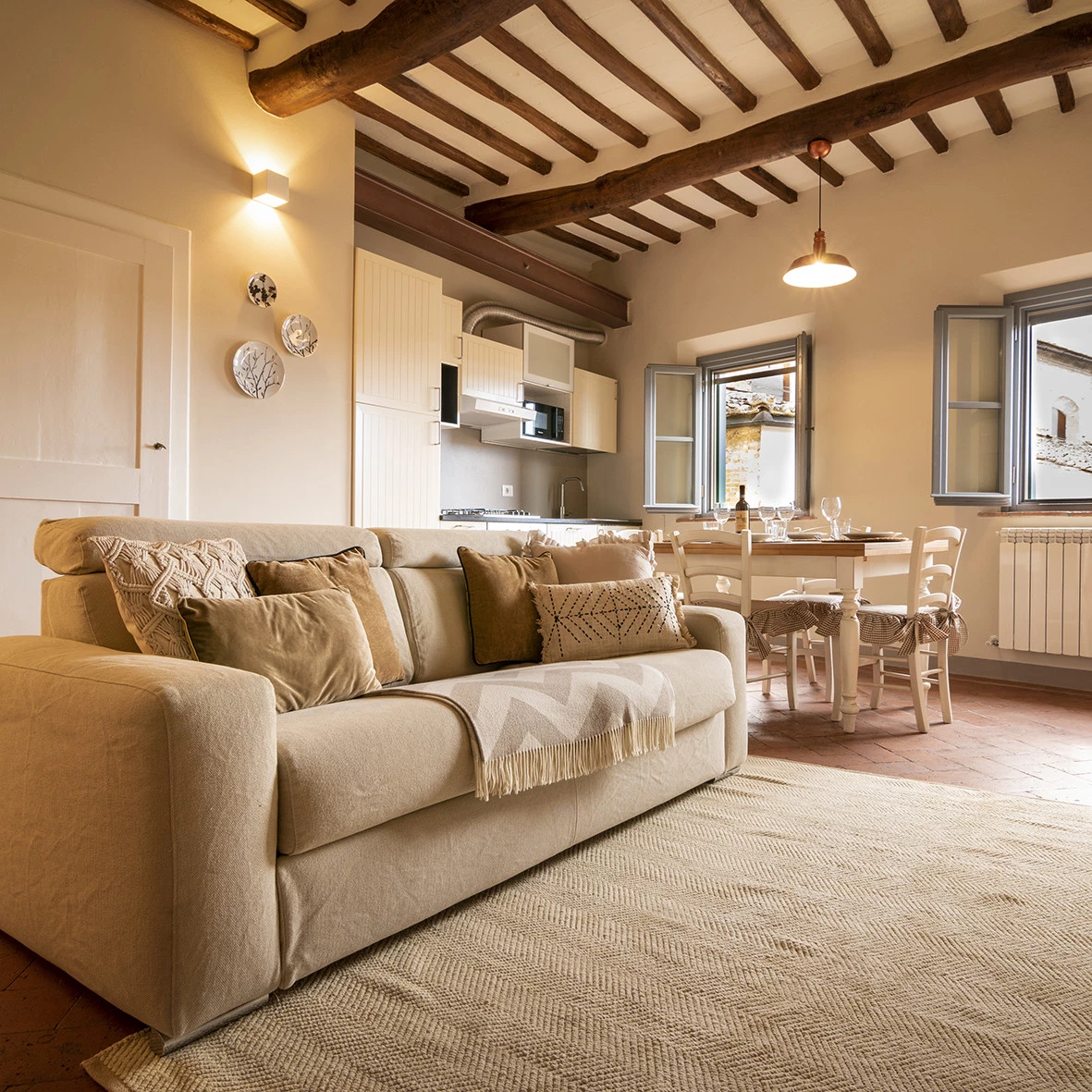L'appartamento si trova nel centro storico di San Miniato al terzo piano di edificio senza ascensore, è disposto su un unico livello di 55 mq e si presenta come monolocale open space con cucina a vista. Possono soggiornarci al massimo 4 persone. E' dotato di connessione internet, smart TV, riscaldamento autonomo, cucina completa di forno elettrico, frigorifero, freezer, forno a microonde, lavastoviglie, macchina del caffè, tostapane e bollitore. Inoltre sono presenti lavatrice e asciugatrice.