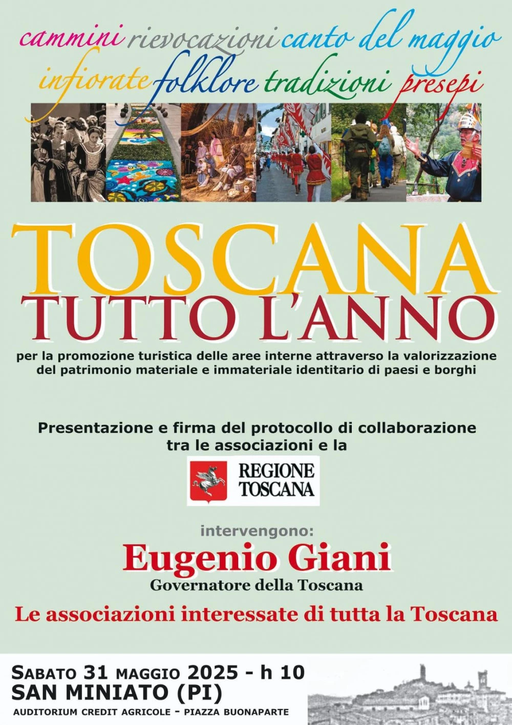 Sabato 31 maggio 2025, alle ore 10.00, all'Auditorium Crédit Agricole di Piazza Buonaparte, la Città di San Miniato ospiterà un'importante iniziativa a carattere regionale, la firma del Protocollo di intesa tra la Regione Toscana e le Associazioni toscane per le manifestazioni folkloristiche, le rievocazioni storiche, le tradizioni, il canto del maggio, le infiorate, i cammini e i presepi. Si tratta di un'occasione importante per il territorio che su questi temi ha costruito negli anni aspetti della propria identità e occasioni di promozione sostenibile, alla quale avremmo il piacere della vostra presenza. Si invitano pertanto associazioni, cittadini e cittadine, che potranno partecipare anche con gonfaloni e in costume.